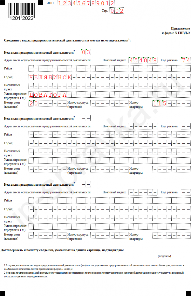 В заявлении можно указать несколько адресов и видов бизнеса, которые переводятся на ЕНВД . Для этих целей предусмотрено три блока полей на второй странице заявления.