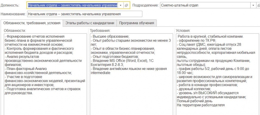 Вкладку «Обязанности, требования, условия» мы видим в нижней части формы. В табличной части «Обязанности» располагаются функции, которые должен будет выполнять будущий сотрудник.