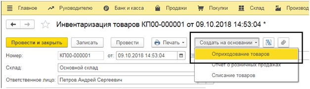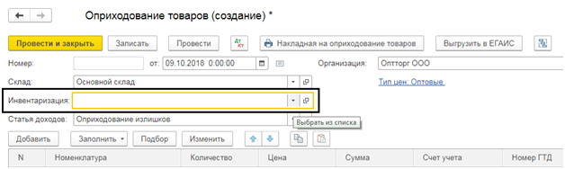 Открываем окно нового документа, заполняем реквизиты, в строке «Инвентаризация» выбираем документ, на базе которого и будет выполнено оприходование.