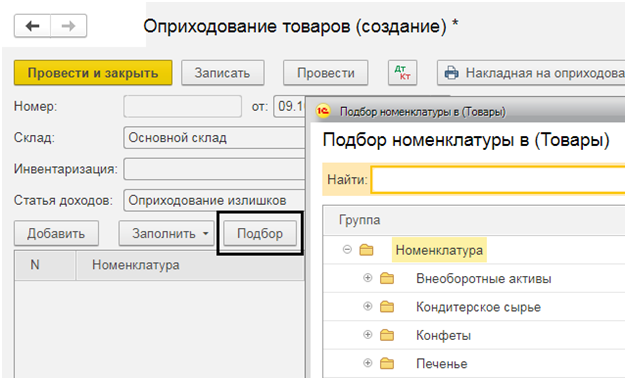 Если процедура оприходования товаров не связана с ревизией, то сведения в таблице заполняются вручную: отражаем статью доходов («Прочие доходы и расходы»), склад приема, нажимаем «Подбор» и выбираем товары, подлежащие оприходованию.