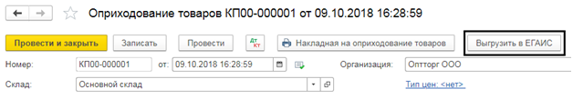 Стоит отметить, что в некоторых случаях может потребоваться отразить приход алкогольной продукции. В нашем документе есть специальная клавиша – «Выгрузить в ЕГАИС», позволяющая сформировать «Акт постановки на баланс ЕГАИС».