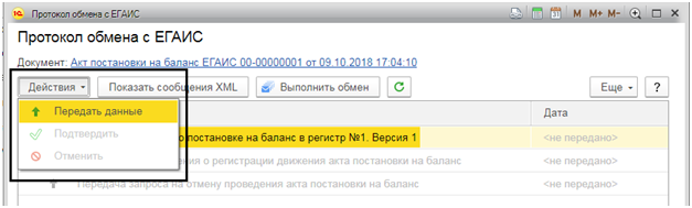 Выбирая строку «Протокол обмена» можно сформировать документ ЕГАИС, а отправить – нажав кнопку «Передать данные».