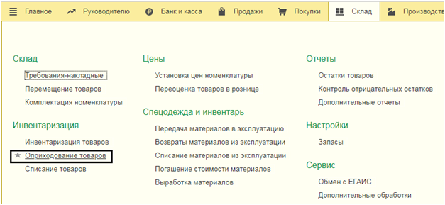 Если инвентаризация заполнена, то оприходование излишек можно выполнить с помощью меню «Склад» и использования журнала «Оприходование товаров».
