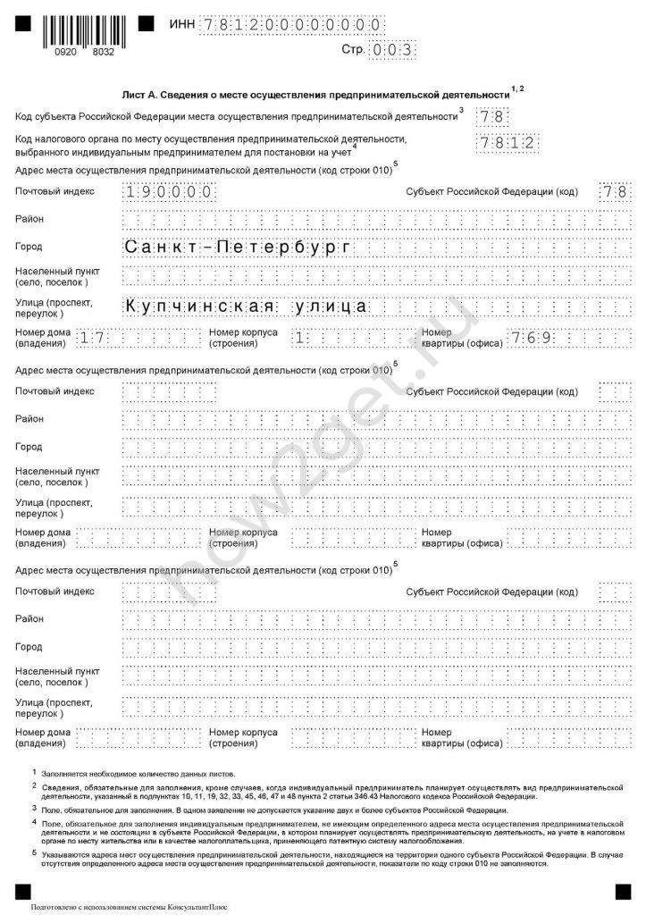 Этот лист бланка заявления на патент для ИП посвящен месту осуществления предпринимательской деятельности. Иными словами, указывается, где будет вестись бизнес.