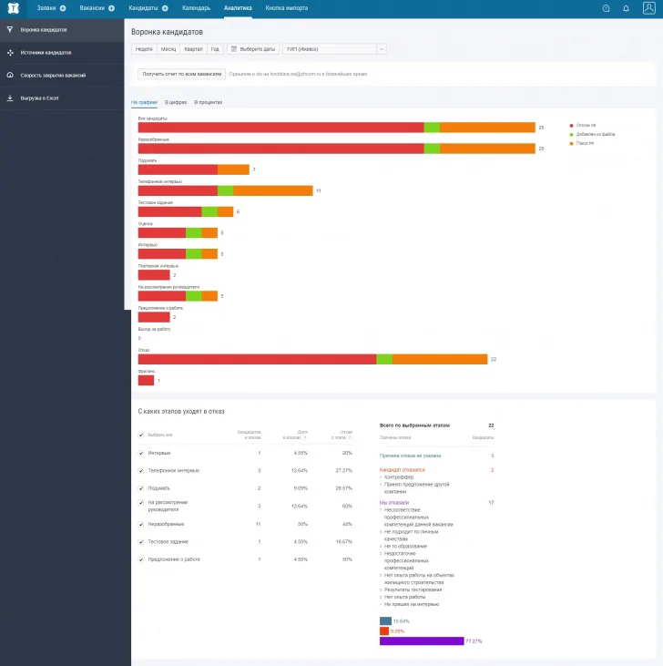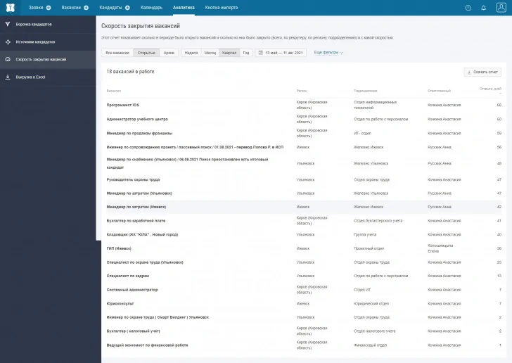 - директор по персоналу наглядно видит, как идет работа рекрутеров, и может перераспределять нагрузку между ними;