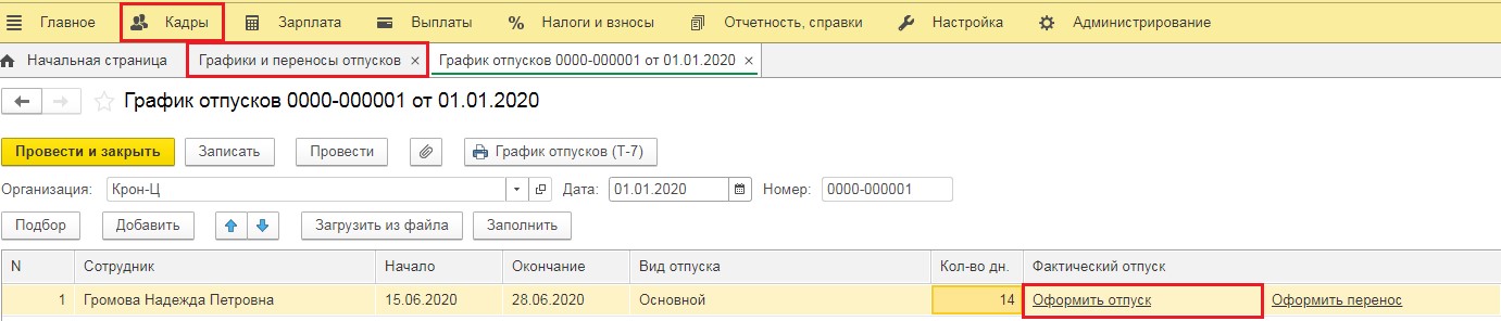Зайдем в категорию «Зарплата» и кликнем «Отпуска». Если вы до этого внесли документ «График отпусков» в категории «Кадры» — «Графики, переносы отпусков», то оформить документ «Отпуск» можно, зайдя в графике по ссылке «Оформить отпуск».