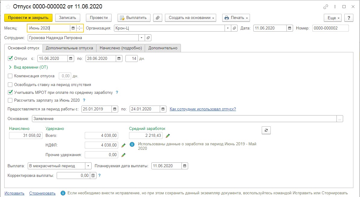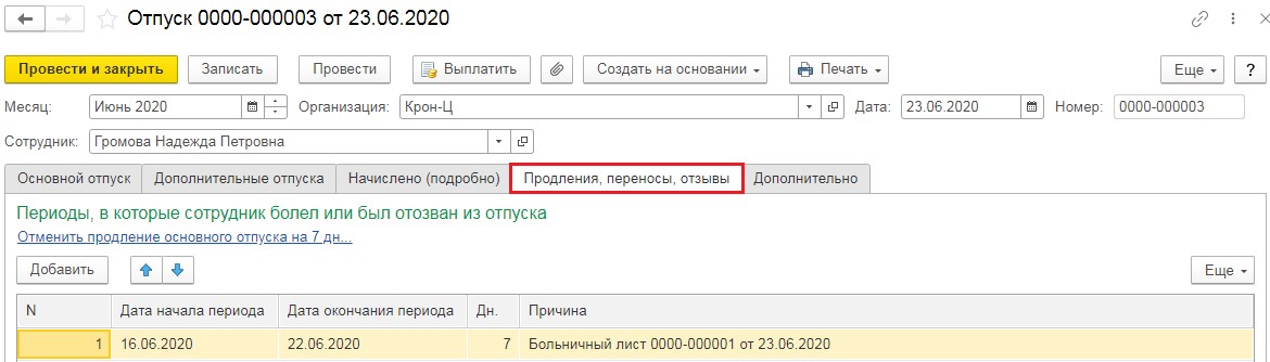В графе сообщений возникнет надпись «Основной отпуск продлён на 7 дней. Дата окончания перенесена с 28.06.2020 на 05.07.2020».