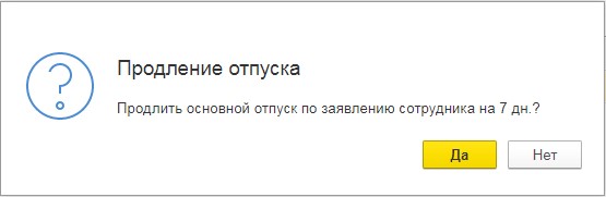 Кликнем на ссылку, приложение покажет окно с вопросом записать ли сведения больничного, нажимаем «ОК». Потом вам покажут новый вопрос, на этот раз о продлении отдыха на время больничного. Если работника устраивает такой вариант, кликаем «Да».