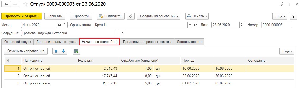 В разделе «Начислено (подробно)» показано, что срок больничного убран из периода отдыха.